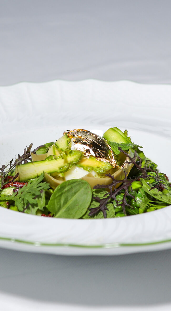 AntipastoUovo alla Fabergé: panatura alle erbe, vignarola di primizie primaverili ed erborinato di capra